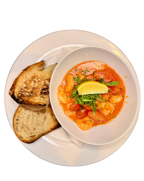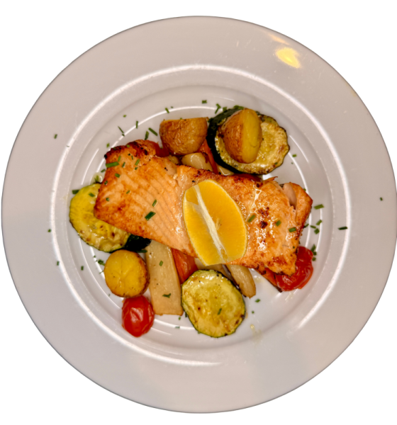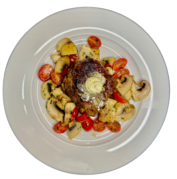 Se sázeným vejcem, slaninkou, hranolky a demi-glace.