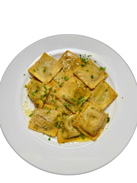 Plněné ravioli s hovězím a vepřovým masem, na másle s redukcí fondo bruno a parmazánem