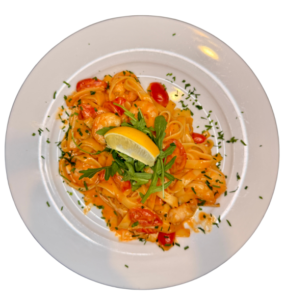 Tagliatelle s krevetami v rajčatové omáčce z cherry rajčat, bílého vína a másla. Dochucené česnekem a olivovým olejem