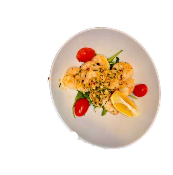Restované tygří krevety na bílém víně, másle a s chilli, servirované s opečeným kváskovým chlebem
